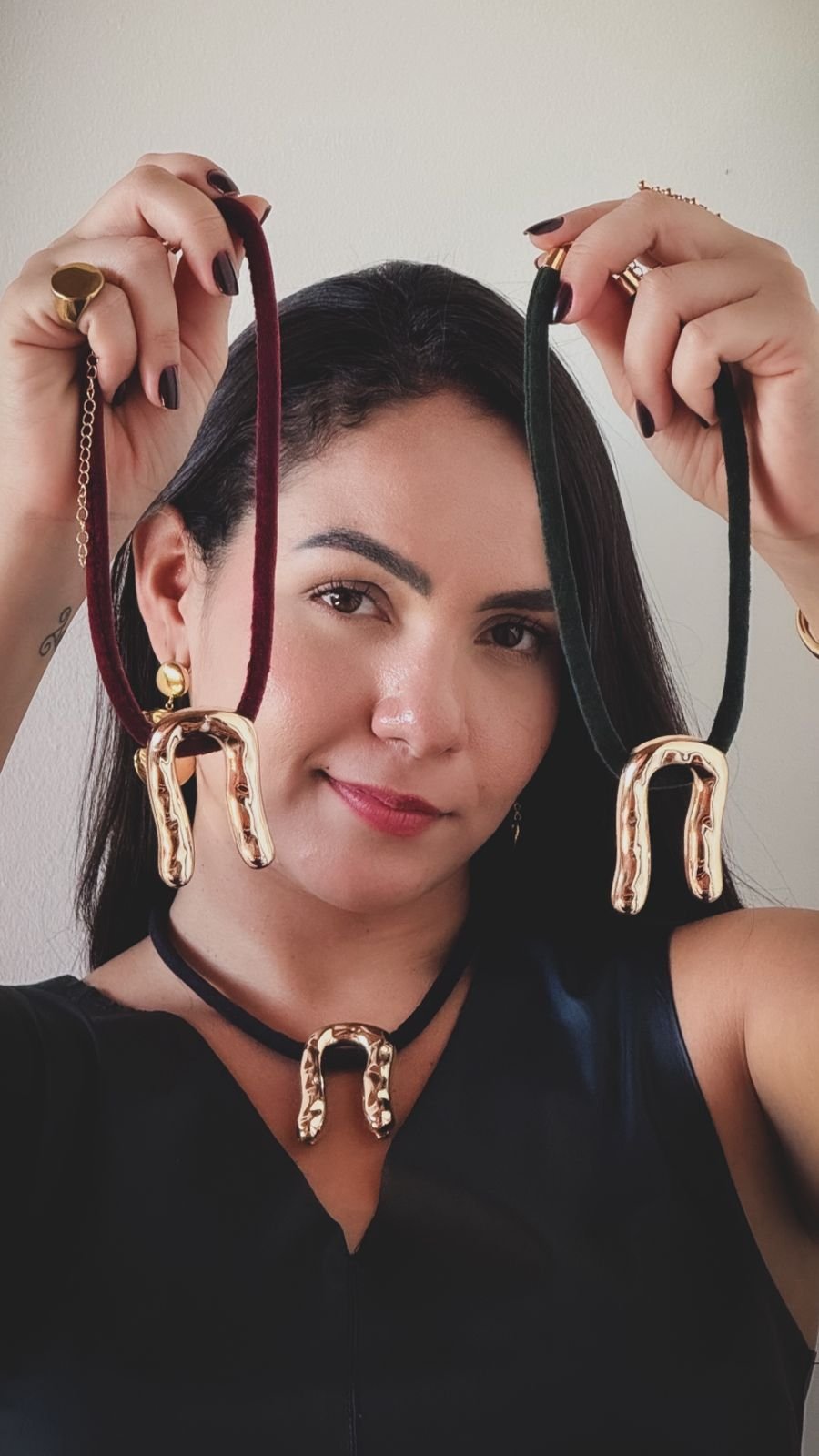 Pura têndência de Outono-Inverno, colar em tecido de veludo e cores marcantes que realçam o poder feminino! Detalhe do pingente orgânico em textura banhado a outro 18k torna a peça atemporal, moderna e cheia de Style Chic!
